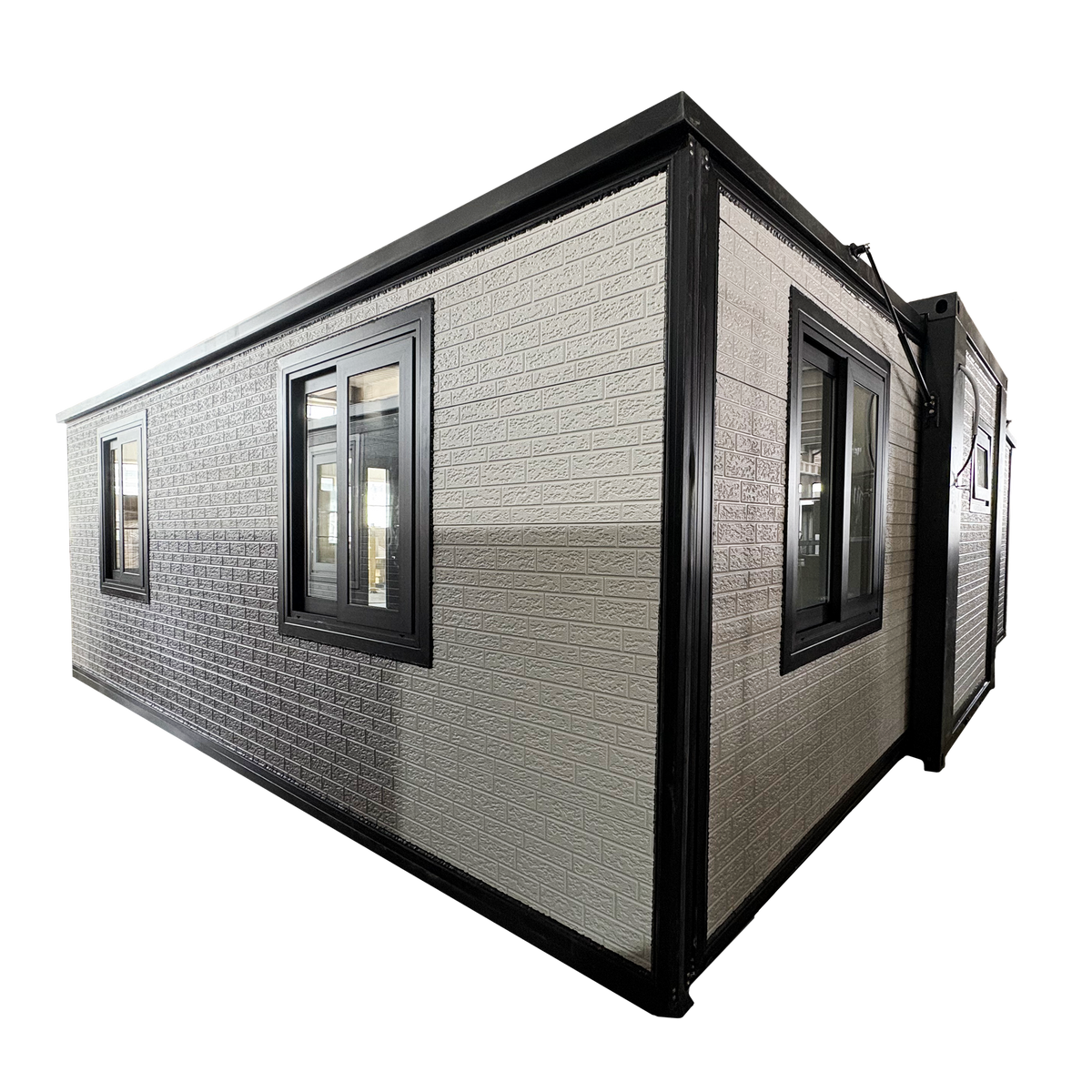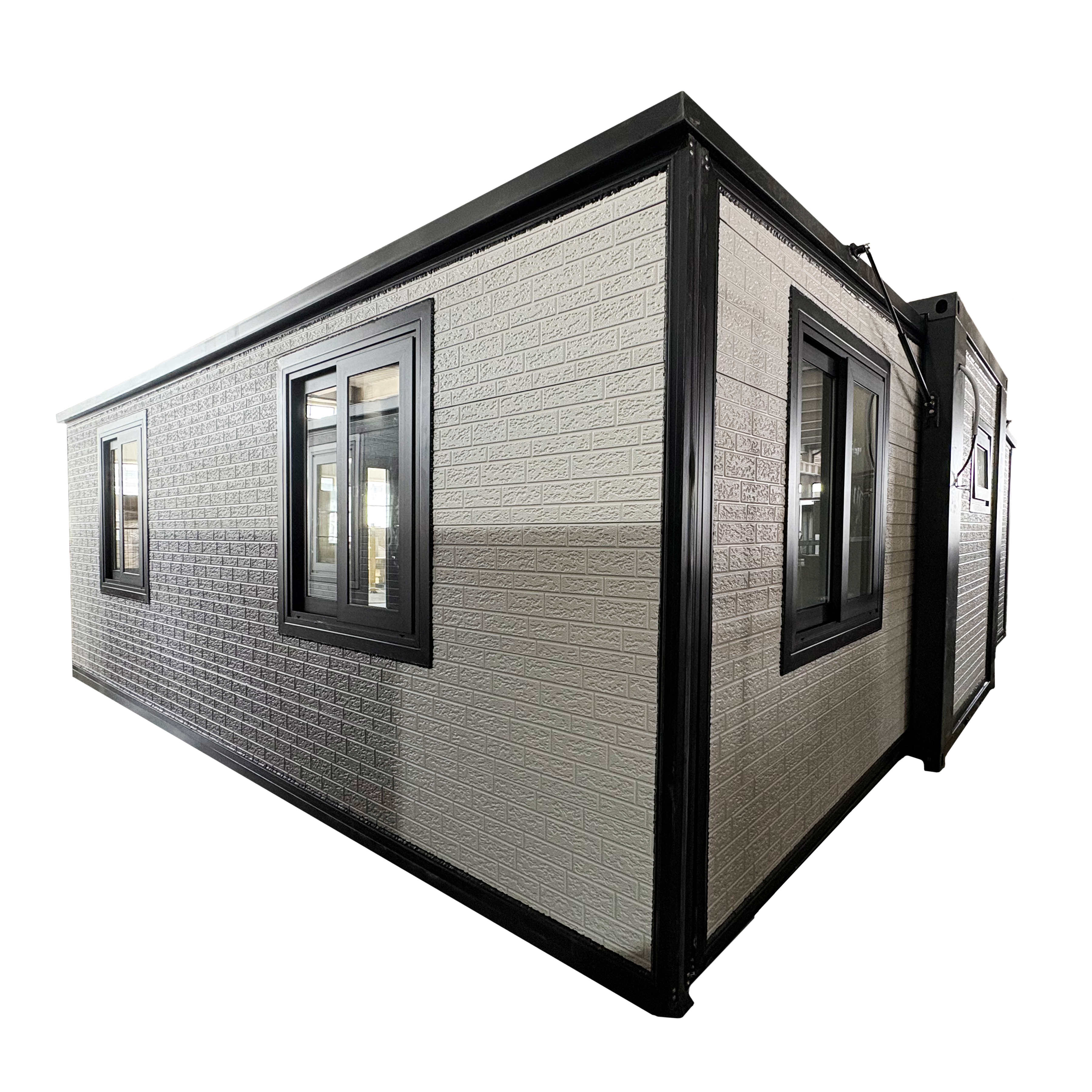 The Bastone Mobile Expandable Prefab House (1920) is constructed with metal embossed panels featuring an integrated insulation layer for enhanced energy efficiency. It complies with U.S. standard 110V electrical wiring, ensuring safe and professional installation. The structure boasts a robust seven-brick-thick wall design (model Br-03-008) with a white coarse-brick finish, providing superior durability and insulation. Included is a built-in cabinet, adding practical storage to this expertly engineered, expandable living space.