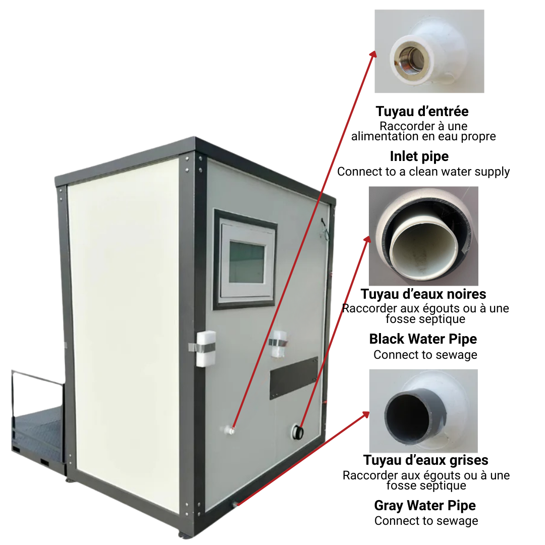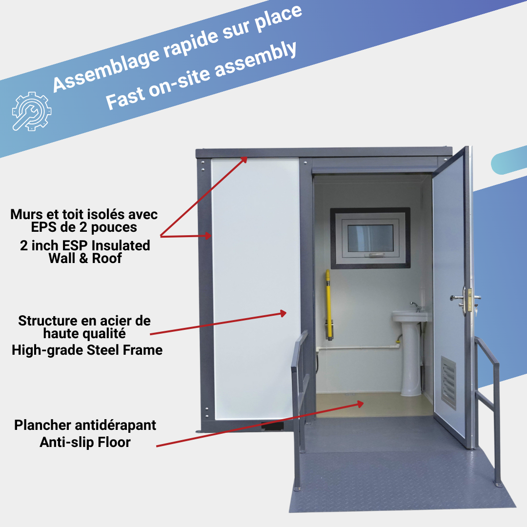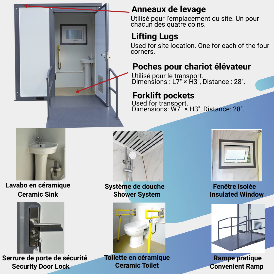 Disabled toilet can accommodate disabled users and can be utilized as a family suite.The Handicap-Accessible Portable Restroom for Disabled Individuals, offers a steel structure, EPS insulated wall panels and roof, and non-slip flooring with a ramp for easy access. Providing a spacious interior and quick installation, these portable restrooms near you ensure convenience and accessibility for all.