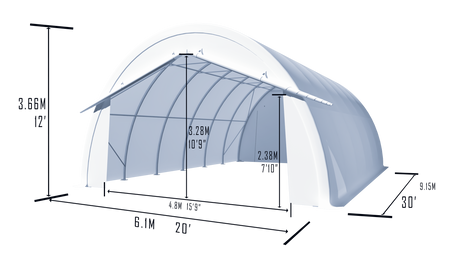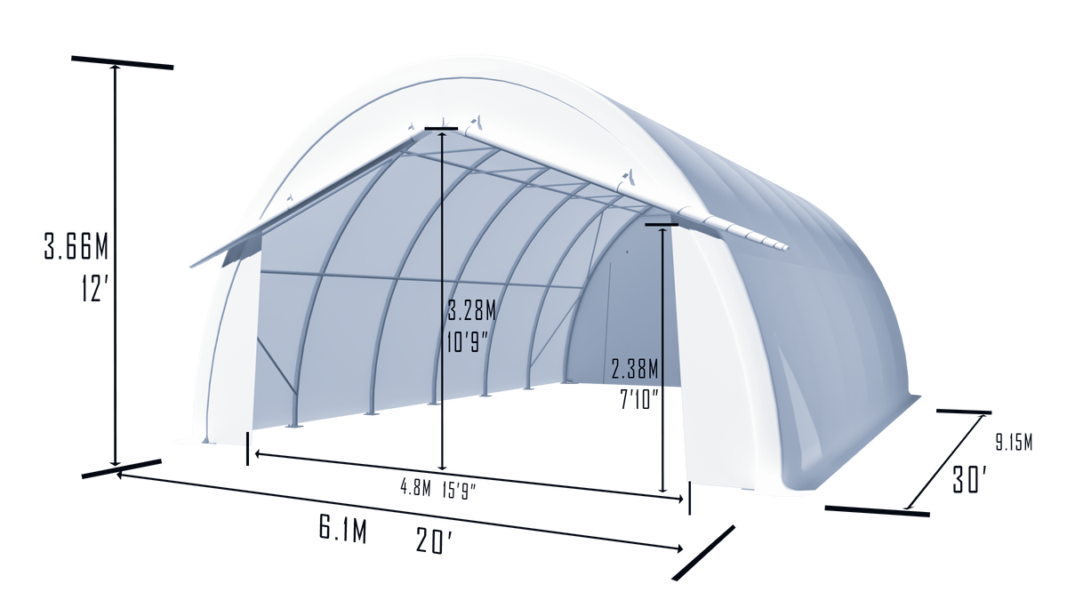 Spacious Dimensions: With a footprint of 20' W × 30' L × 12' H, this shelter accommodates large vehicles, equipment, or bulk storage.