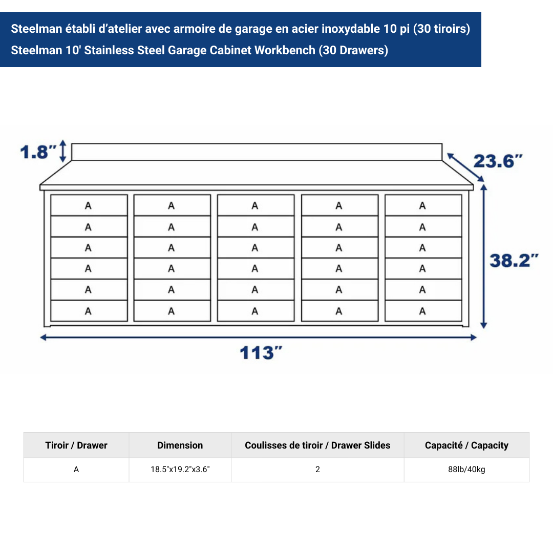 This Steelman 10' Stainless Steel Garage Cabinet Workbench (30 Drawers) is a great choice for those looking for a heavy-duty storage solution. With its industrial-grade roller cabinet, you can store a variety of tools and supplies securely and conveniently. The stainless-steel finish is durable, easy to clean, and looks great in any garage. The drawers come with locks and anti-slip inners, and the pre-cut drawer liners ensure that your items stay in place. The 3-rail sliding system provides a smooth and secure operation, and the secure detents keep the drawers closed. This storage cabinet is perfect for any garage, storage room, basement, hobby room, laboratory, or office. Get organized and maximize your space with this Steelman 10' Stainless Steel Garage Cabinet Workbench (30 Drawers).