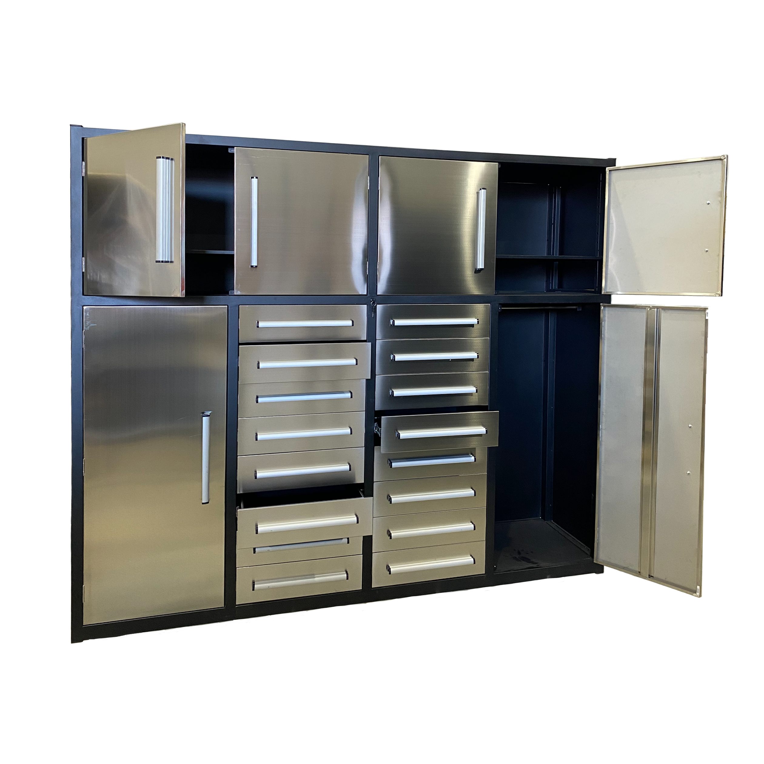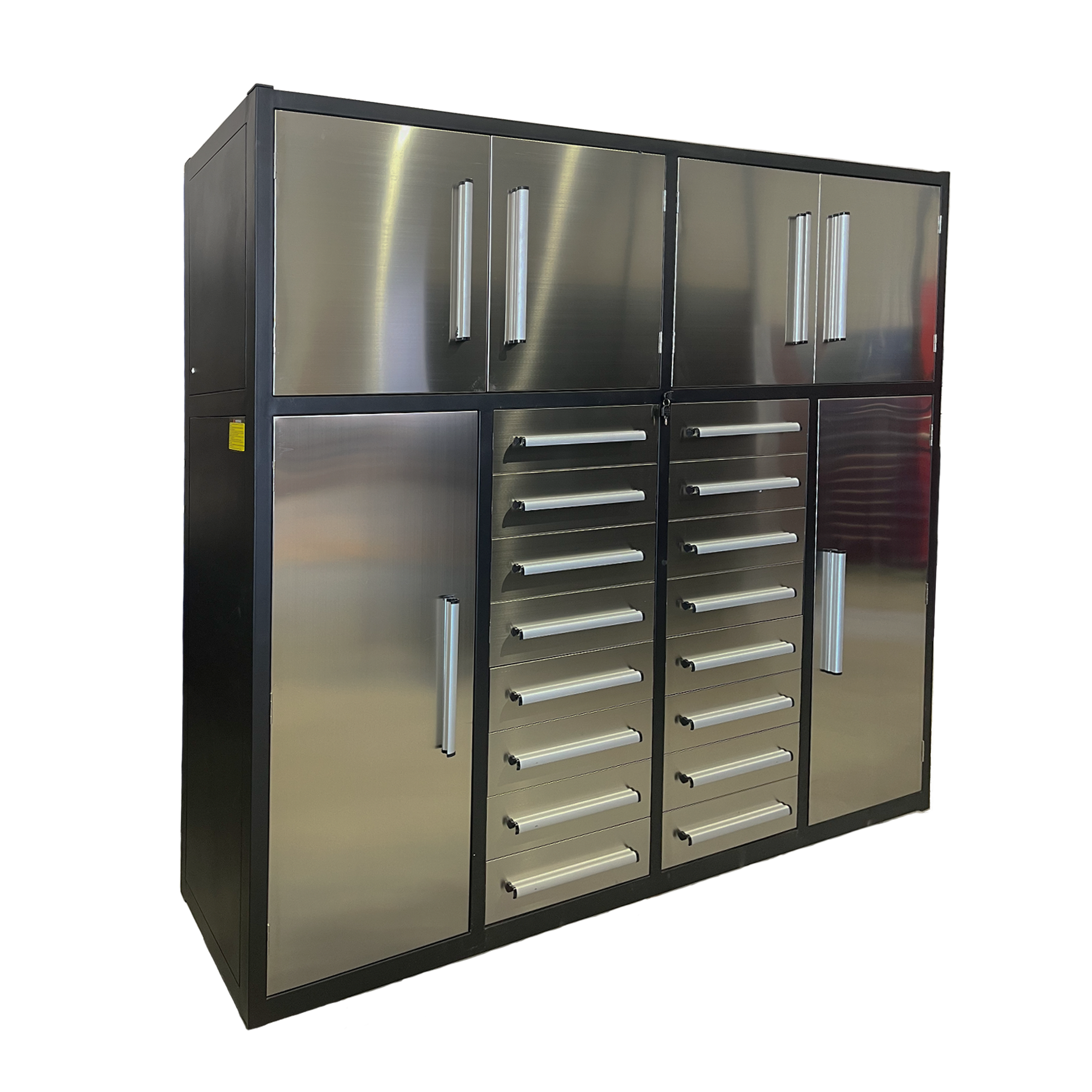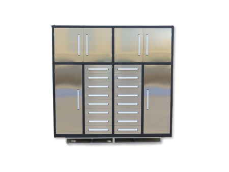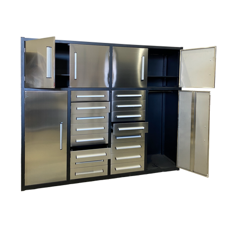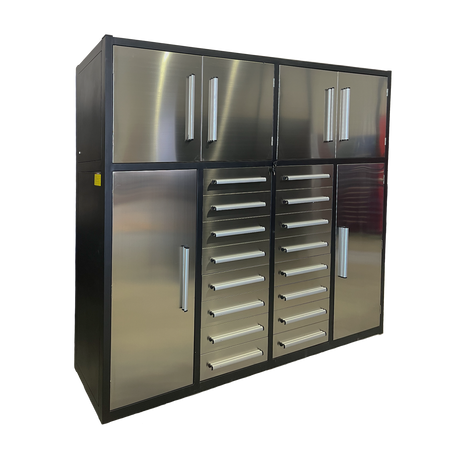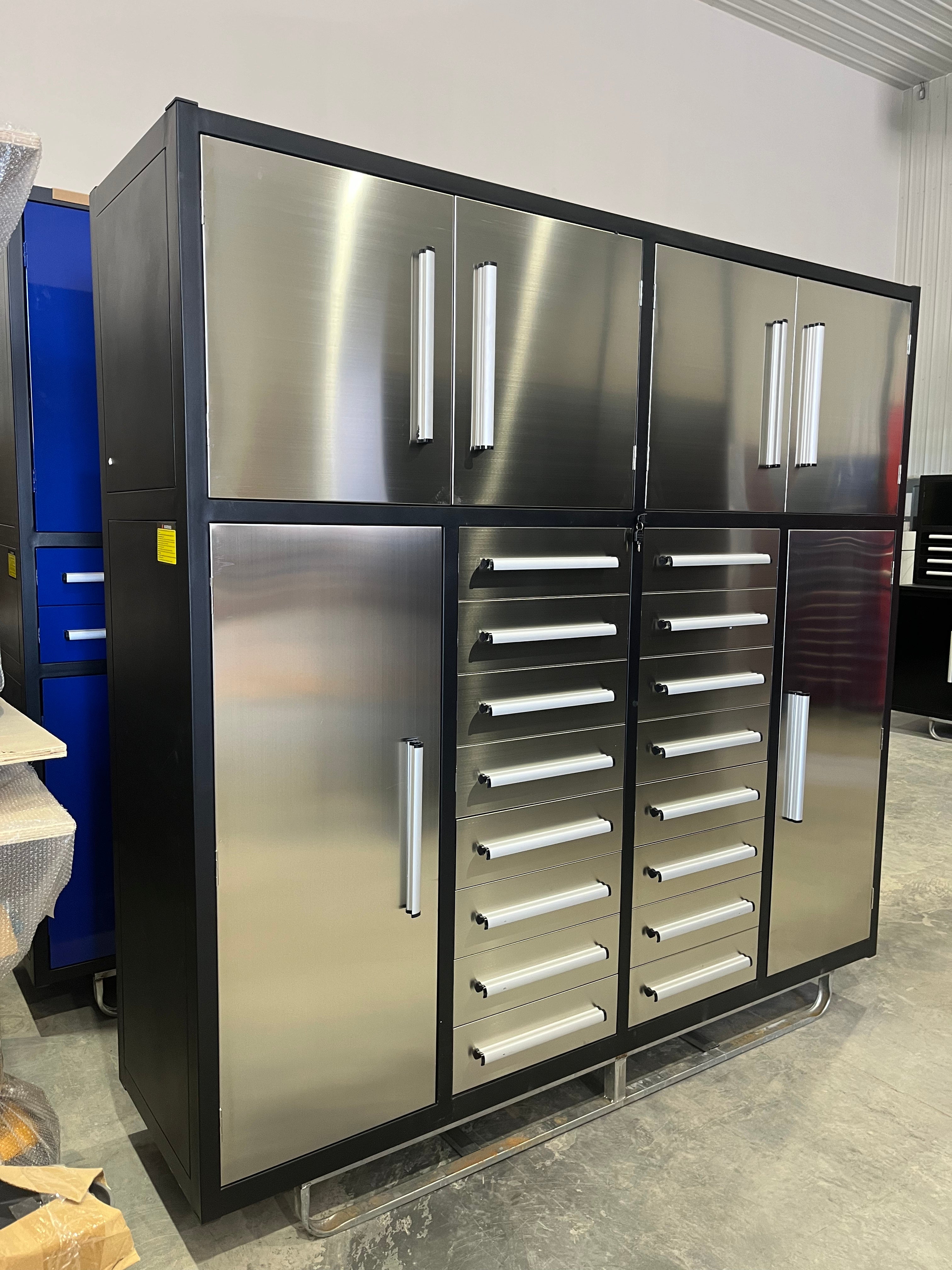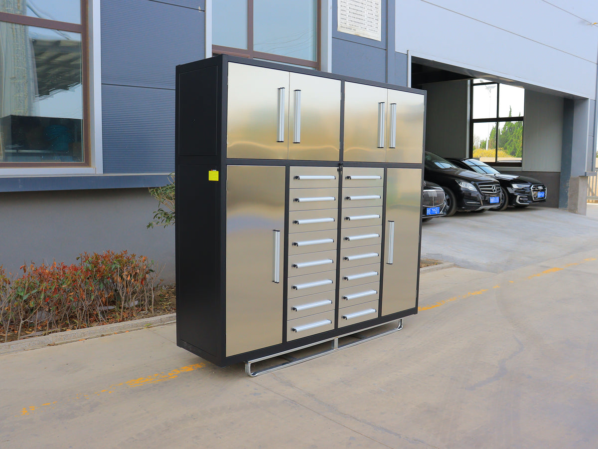 This Steelman 7' Garage Cabinet (16 Drawers) is the perfect addition to your home, garage, workshop, basement, or laboratory. With 16 drawers, you'll be able to store and organize both big and small items with ease. The upper cabinets are great for storing space-consuming but not commonly used items, while the side cabinets provide the perfect place to hang clothes and keep them tidy. The drawers are equipped with locks and anti-slip inners, non-slip pre-cut drawer liners, and secure detents to keep them closed. The heavy-duty double slides on the large drawers and all-welded steel construction make it durable and long-lasting. Plus, the industrial paint finish resists rust and corrosion and is available in both red and blue to match your space. Get organized with the Steelman 7' Garage Cabinet (16 Drawers) today! Production process: Cutting-bending-welding-powder coating.