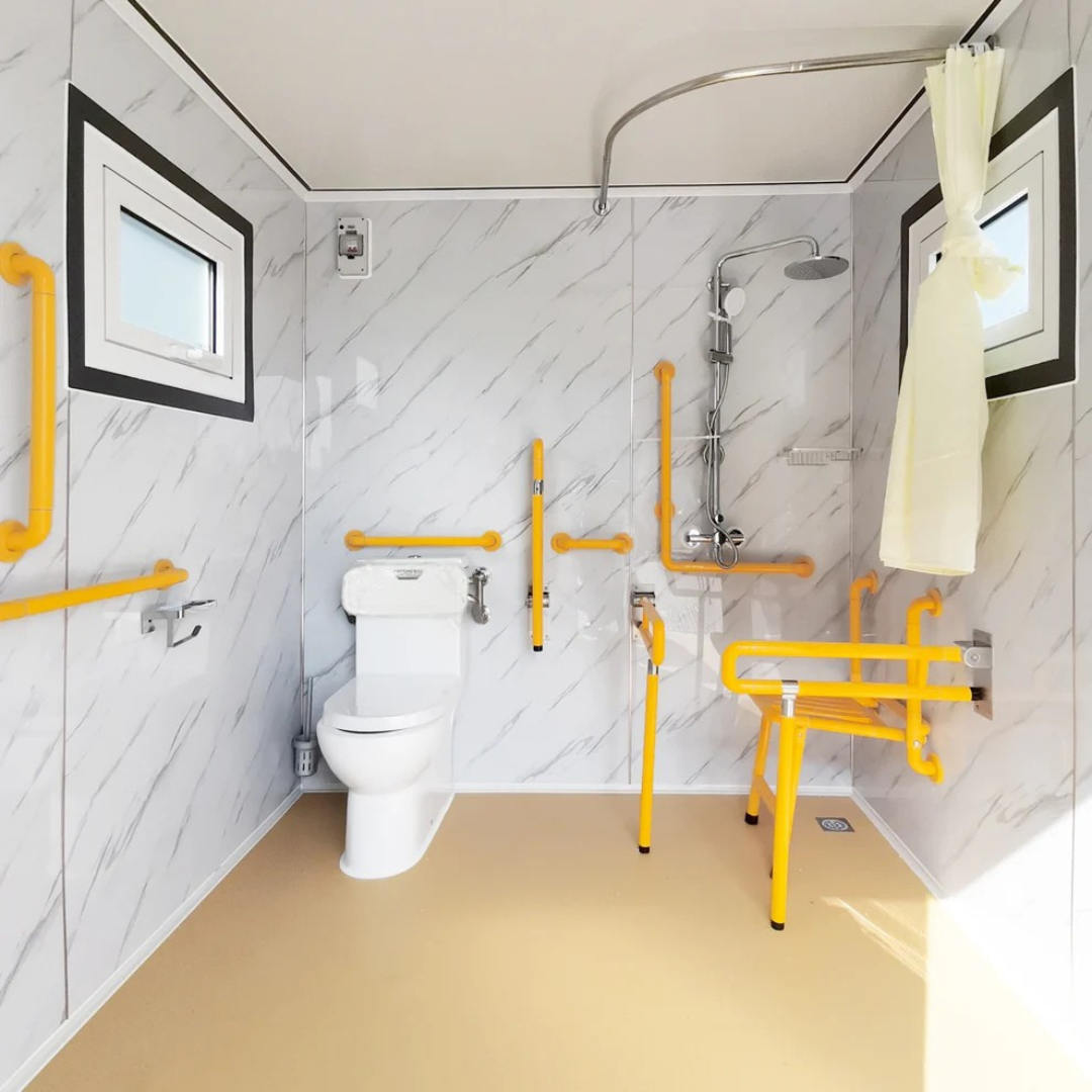 A guardrail beside the toilet provides security and comfort, enhancing accessibility for users with mobility challenges and ensuring stability.